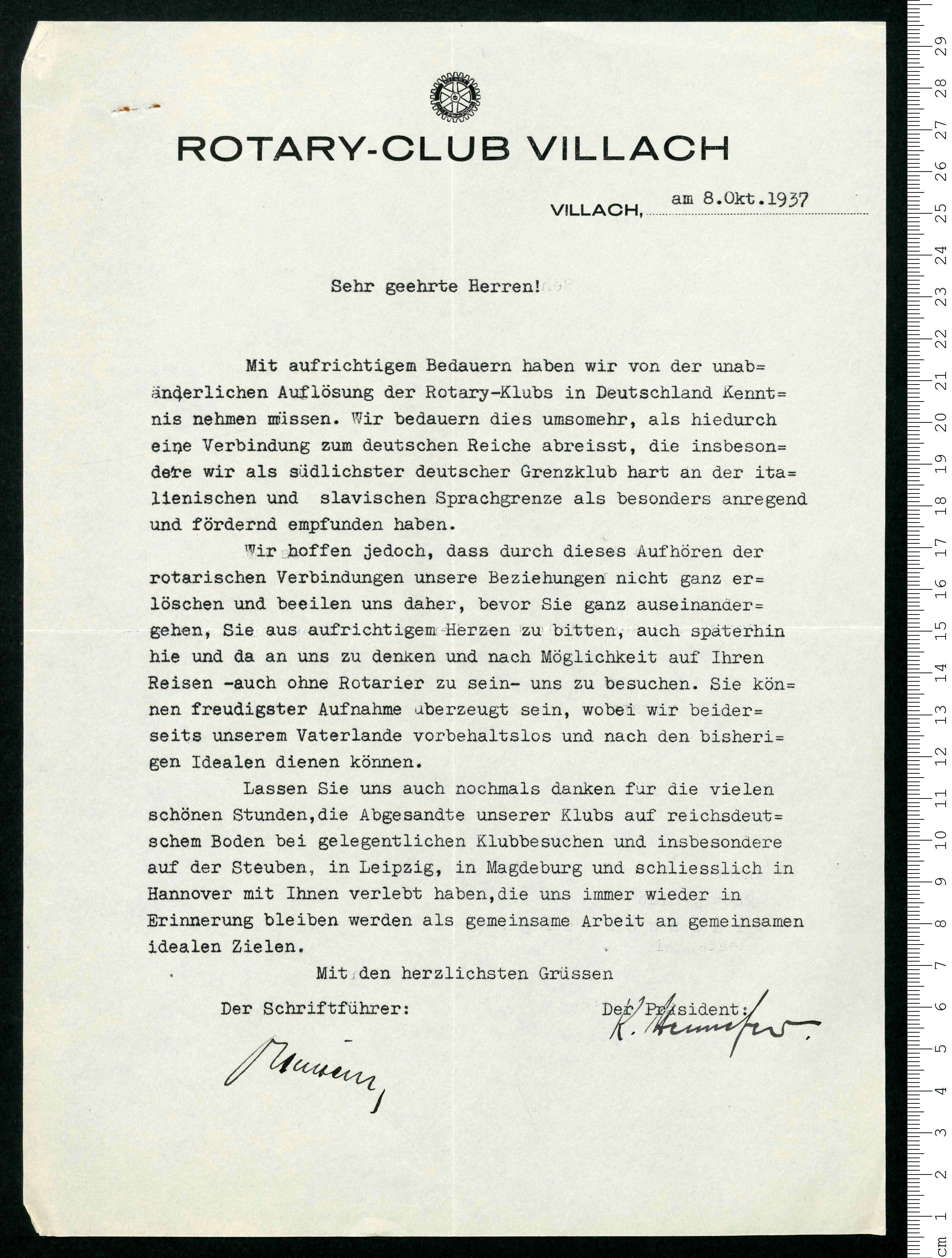 - Reichskommissar für die Wiedervereinigung Österreichs mit dem Deutschen Reich, : Auflösungsakte Rotary-Klub Villach 25. November 1938, Villach, 25. Nov. 1938, , Download